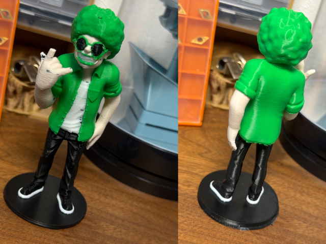 Hitem3Dからは glb、obj、stl、fbxの4つの形式で3Dモデルをダウンロードすることができます。obj形式は色情報を持っているのでそのまま取り込めれ一番いいのですが、Bambu labのスライサーソフトだと安定しないので、今回は一番スタンダードなstl形式を使って印刷していきます。stl形式は色情報は持っていないので、スライサーソフト上で手動で色塗りをしていきます。緑、肌色、白、黒の4色に塗り分けて印刷してきました。